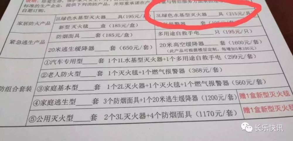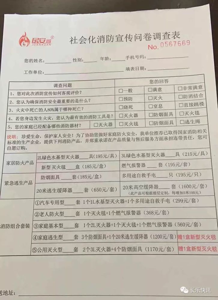 所谓的问卷调查表,实则是产品推销表,表中有:2L绿色水基型灭火器195元一具、3L绿色水基型灭火器215元一具、新型灭火毯185元一盒、燃气报警器195一套、防烟面具185元一盒、多用途自救手电195元一只、20米逃生缓降器650元一套、20米高空缓降器1600元一套等消防器材以及5种消防组合套餐。