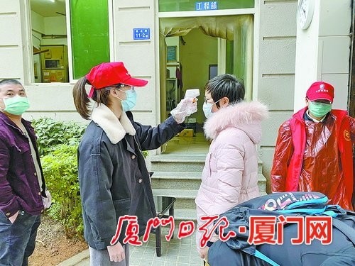 武夷嘉园小区志愿者为进出居民测量体温。