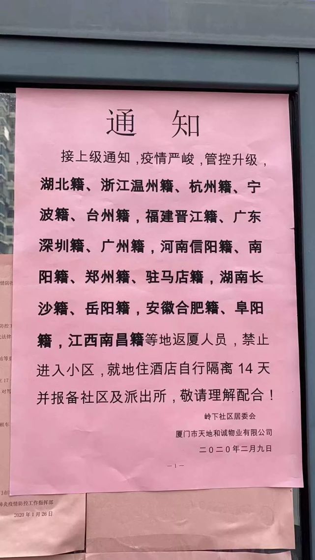 湖北籍、浙江温州籍、杭州籍、台州籍、福建晋江籍、广东深圳籍、广州籍、河南信阳籍、南阳籍、郑州籍、驻马店籍、湖南长沙籍、岳阳籍、安徽合肥籍、阜阳籍;江西南昌籍等地返厦人员,禁止进入小区,就地酒店自行隔离14天并报备社区及派出所。