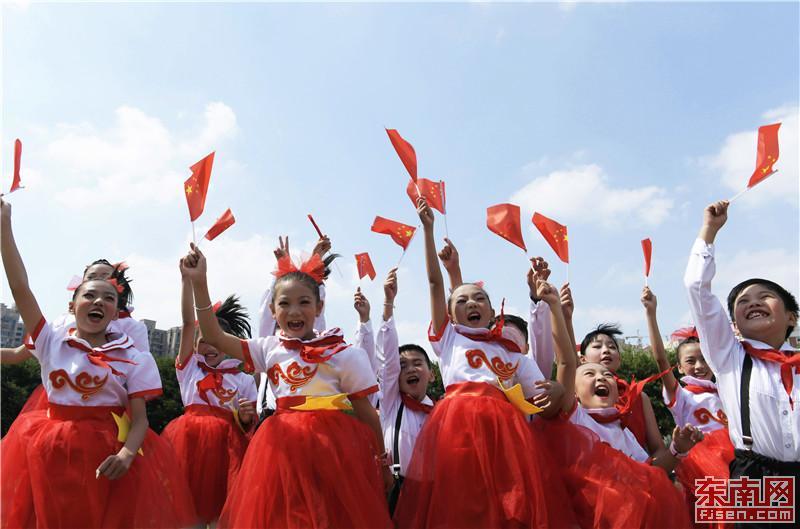 25日,泉州市洛江区的150名优秀少先队员代表,以及全区各中小学少先队总辅导员欢聚在泉州市实验小学洛江校区,举行庆祝新中国成立70周年暨纪念中国少年先锋队建队70周年主题队日活动。图为少先队员们在蓝天下,高兴地挥舞着手中的五星红旗。