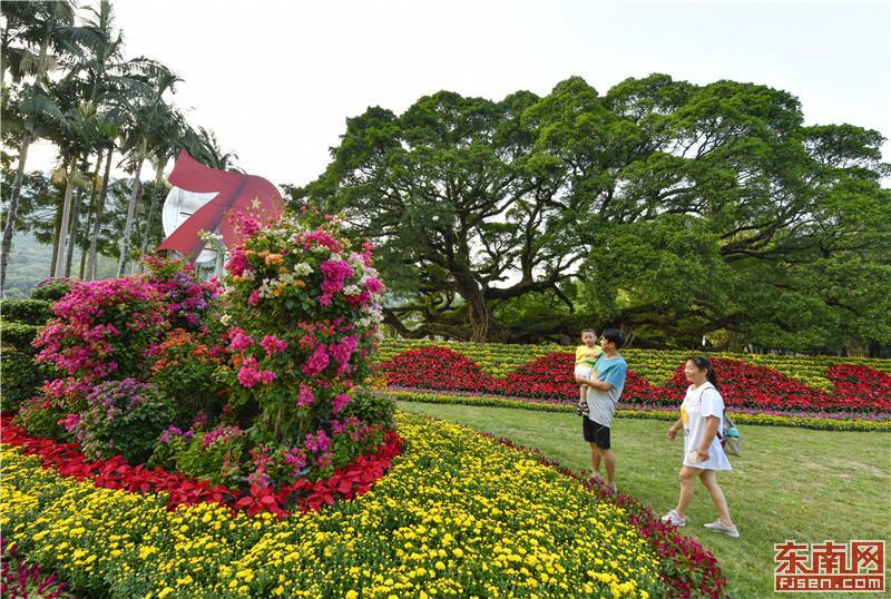 为迎接新中国成立70周年,福州植物园(福州国家森林公园)开展加强生态建设、提升园容园貌的百日攻坚行动,国庆期间,该园将以崭新的面貌迎接八方游客的到来。图为26日,市民在福州植物园大型花坛前游玩。