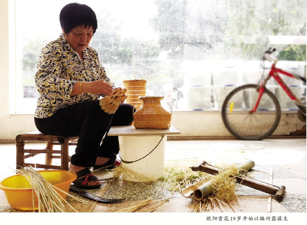 19岁与同村一村民结婚后,欧阳雪花就全职在家里给当时的生产队编织竹筐赚工分,“那时编织竹器的竹子都是自己和丈夫上山现砍的,编织竹器的竹子极为讲究,太老的竹子不行,太嫩的也不行,哪种竹子适合用来编织竹器,得在现场凭经验挑选……”当时,她编织的虽然是生产生活中的实用器具,但练就了极其娴熟高超的编织技艺。