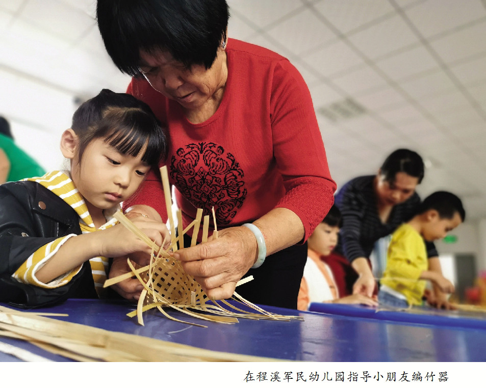 两年前,程溪军民幼儿园聘请欧阳雪花当学校的校外辅导员,每周用一天的时间辅导幼儿园的教师和学生编织竹器。“希望‘竹编进校园’活动能激发孩子们对竹编的兴趣,从而使竹编手艺得以传承。”说这话时,欧阳雪花脸上露出了一丝欣慰。