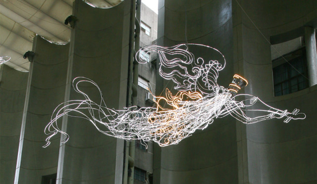 2013年,吴达新的老家泉州与韩国光州、日本横滨共同入选首届“东亚文化之都”。当时,光州、横滨两座城市的当代艺术已经繁荣,横滨三年展、光州双年展都是亚洲著名艺术大展,泉州在这方面却近乎空白。收到家乡创作邀请后,吴达新决定以当代艺术的语言和手法,讲述传统文化故事,创作了《飞天雅音》。“我用螺纹钢、LED灯组合新手法,重现宋代人对天际飞翔的向往。”吴达新说。