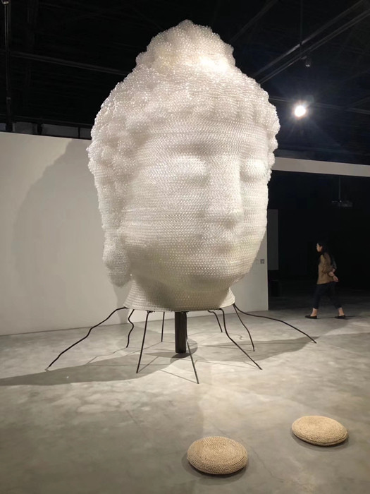 吴达新的代表作品中,有一尊《药师佛》——用了3万个药瓶,花了6个月时间,经历数十次失败,制作出一个5米高的佛头。前段时间,《药师佛》在四川参加了安仁双年展。