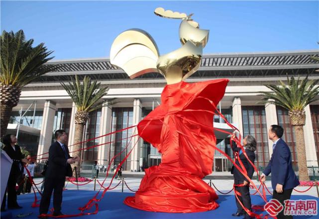 19日下午,第28届金鸡百花电影节金鸡雕塑在厦门海峡大剧院前广场落成。著名雕塑家吴为山应中国电影家协会主席陈道明之邀特别设计的金鸡形象昂扬向上、充满朝气,寓意中国电影事业蓬勃、健康发展。福建日报记者 施辰静 摄