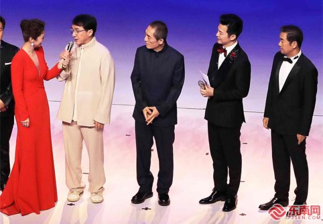 电影节开幕式上,成龙(左二)、张艺谋(中)、张国立(右一)等影人为中国电影寄语。 福建日报记者 施辰静 摄