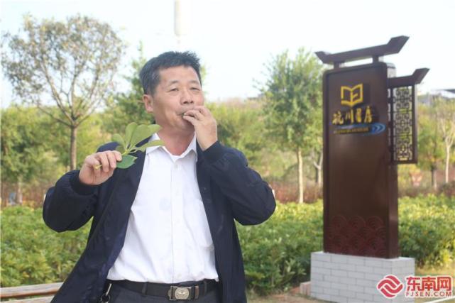 谢秀山在公园练习树叶吹奏。 东南网记者 李凌生 摄