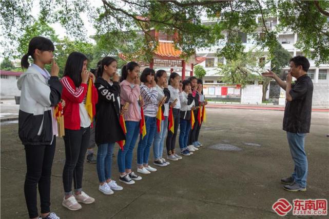 邱少春在上杭县庐丰民族中学上树叶吹奏课。(上杭县树叶吹奏协会供图)