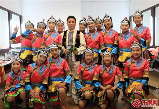 邱少春与庐丰民族中学树叶吹奏学员演出后合影。(上杭县树叶吹奏协会供图)_