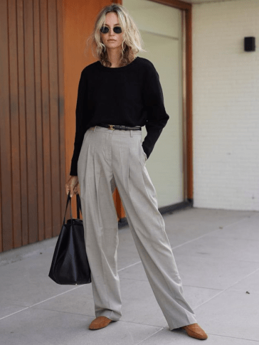 宽松的大毛衣和阔腿裤可以共同营造舒适的衣着空间,大毛衣常常也会更厚实,能穿出带有暖意的慵懒氛围。