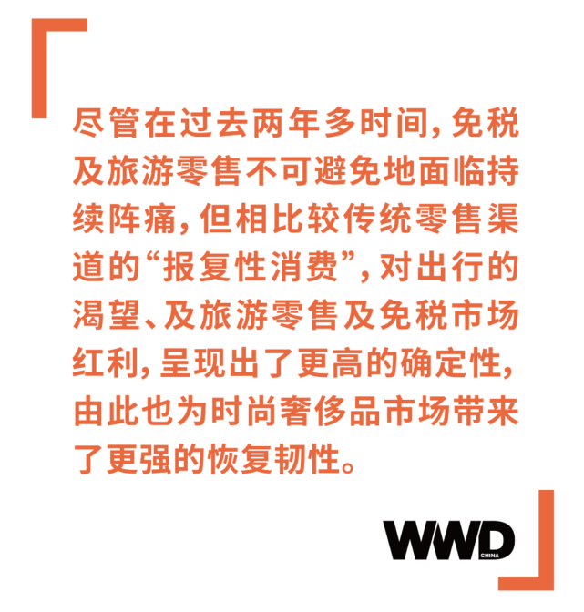 对于过去两年的中国市场而言,其韧性则体现地更为典型 -- 当跨境出行受阻,得益于中国政府快速有效的防疫政策,时尚奢侈品消费的回流、以及一系列包括额度提高和种类扩张免税新政的出台,中国旅游零售与免税市场,更是在过去两年跃升至全球首位,强烈作用于时尚奢侈品市场的恢复和增长。