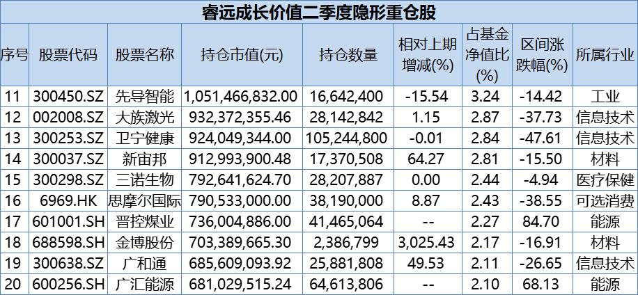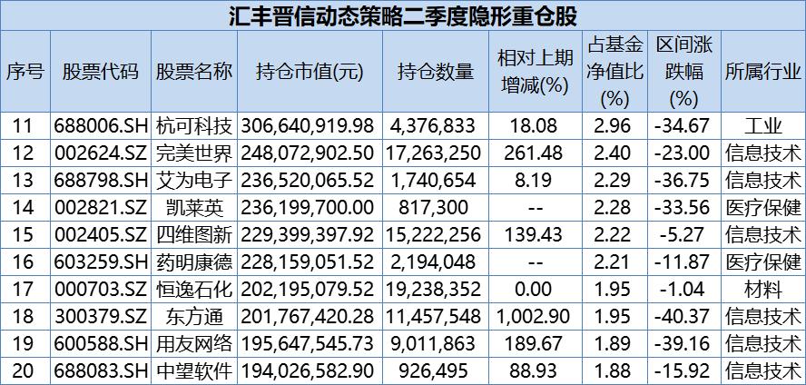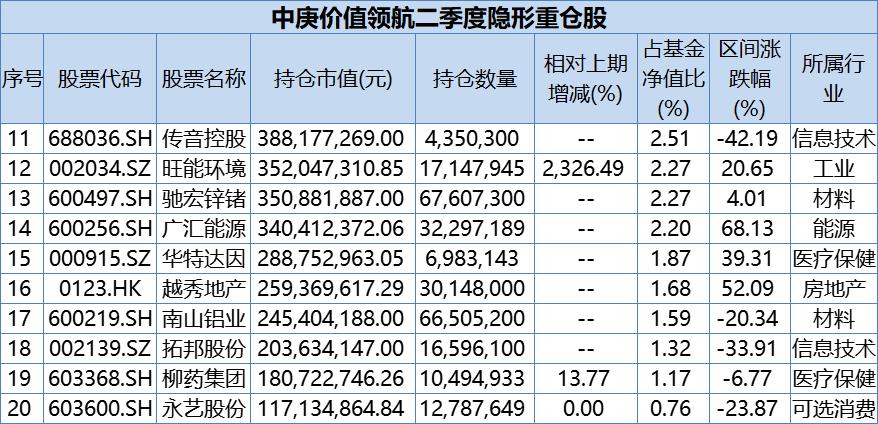 通常基金季报只披露基金持有的前十大重仓股,在前十大重仓股以外,位列基金持有股票占基金资产净值比第11—20位的个股会在中报及年报中披露,这些个股在持仓中占比并不低,被业内成为“隐形重仓股”,是基金中报及年报中备受关注的重要信息,可以更全面地看出基金经理的调仓思路。