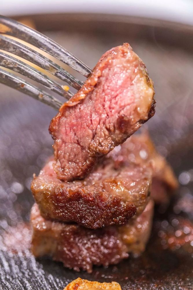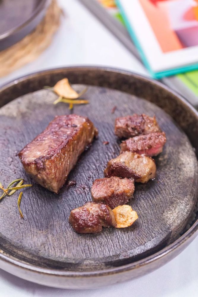 温柔地切开娇嫩的牛肉,内里还保持着少女感十足的樱绯色,每一口都juicy又多汁。