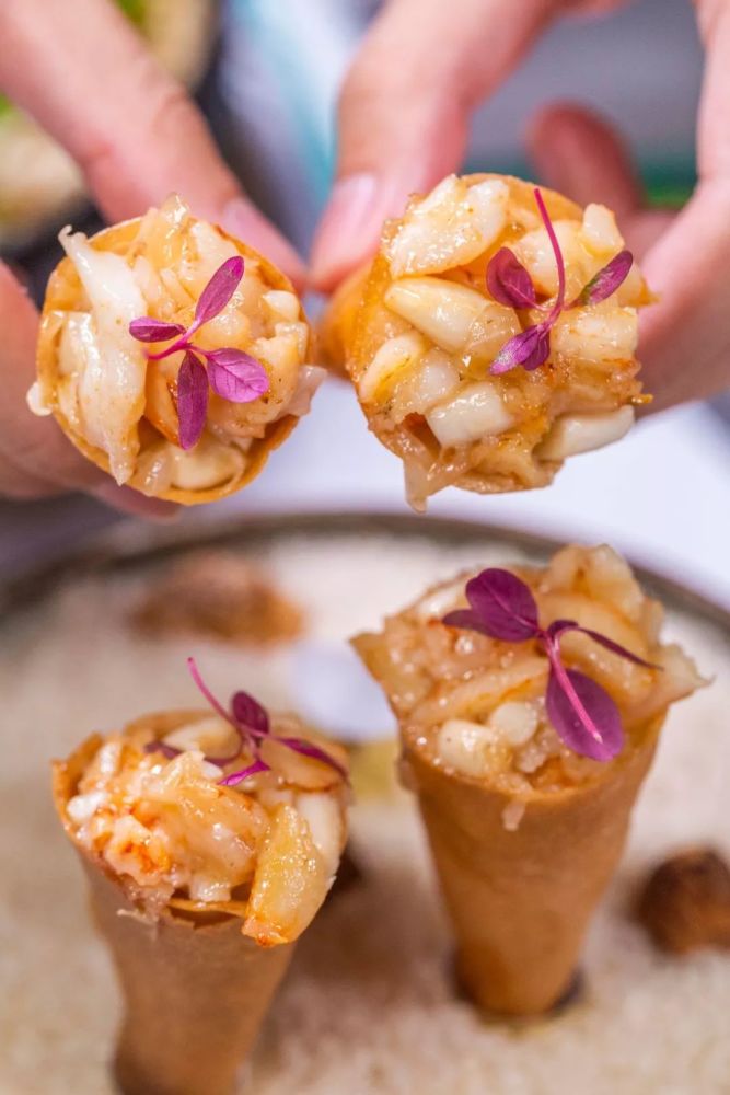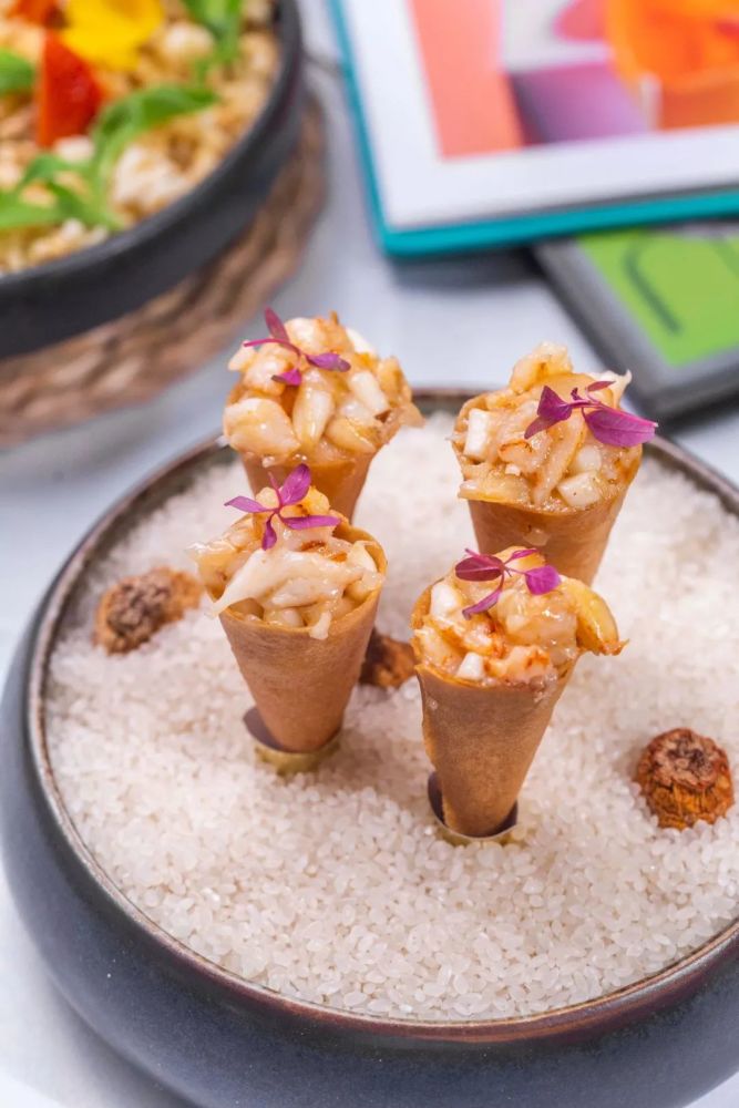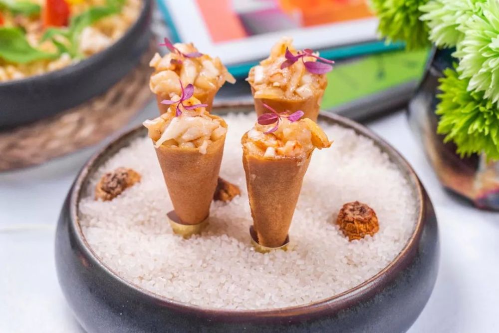 顶级蟹腿肉搭配雪白白玉菇煎制,出锅前加入醇香白松露酱爆炒,盛入酥香手卷当中,满嘴都是满足的咸鲜酥香。