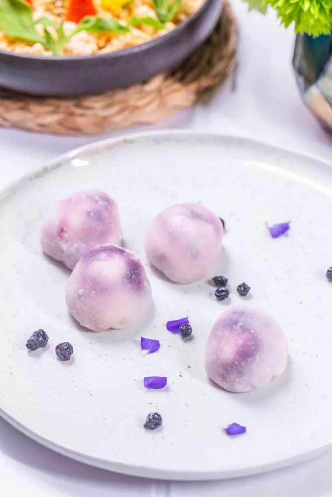 餐后的小甜点蓝莓沃思,甜香温柔的奶油裹胁着蓝莓酱,每一口都叫人忍不住嘴角上扬。