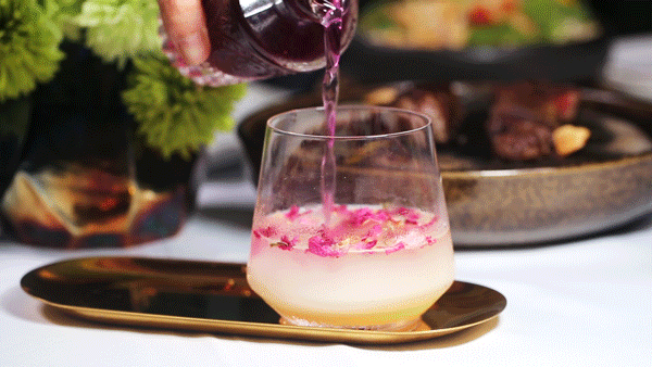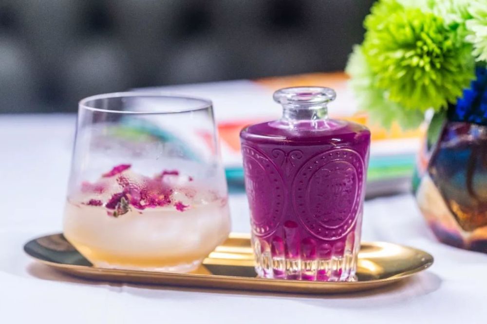 形似香氛瓶的“艳遇”,以天然黑枸杞调合出神秘而妖娆的迷情紫色。倾倒进宽口杯中,浓郁的色彩化进奶甜的可尔必思,沉睡在冰块当中的粉玫瑰渐渐苏醒。