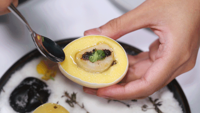 看起来平平无奇的鸽子蛋也暗藏玄机。用小勺子轻轻敲开,芒果酱伪装的蛋黄就存在也藏不住啦。口感甜香,最适合吃完肉类缓解油腻。