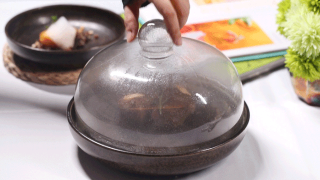 还有仪式感十足的香草烟熏安格斯小牛肉,腾云驾雾地上了桌,开盖的瞬间烟雾伴着肉香迅速席卷鼻腔,瞬间着迷!