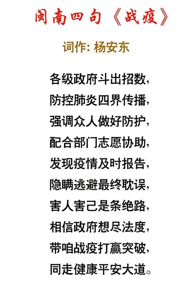 泉州市市级非物质文化遗产项目“泉州歌诀”代表性传承人杨安东,连夜创作闽南四句的《战疫》,劝导民众“发现疫情及时报告,隐瞒逃避最终耽误,害人害己是条绝路”,激励大家“相信政府想尽法度,带咱战疫打赢突破,同走健康平安大道”。