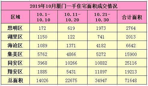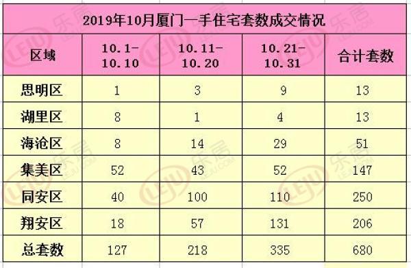 从区域来看,10月份同安区一手住宅成交250套,位列住宅成交排行榜首位;翔安区成交206套,位列排行榜第二位;集美区成交147套,位列排行榜第三位。