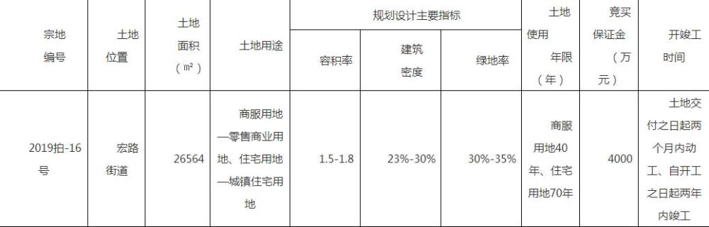 地块编号2019拍-16号,土地位置宏路街道,土地面积2.66万平,土地用途为商住用地,容积率1.5-1.8,建筑密度23%-30%,绿地率30%-35%。