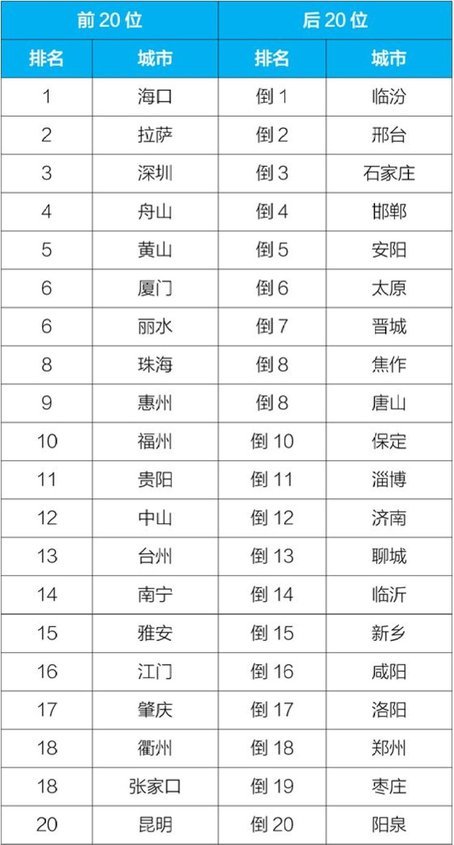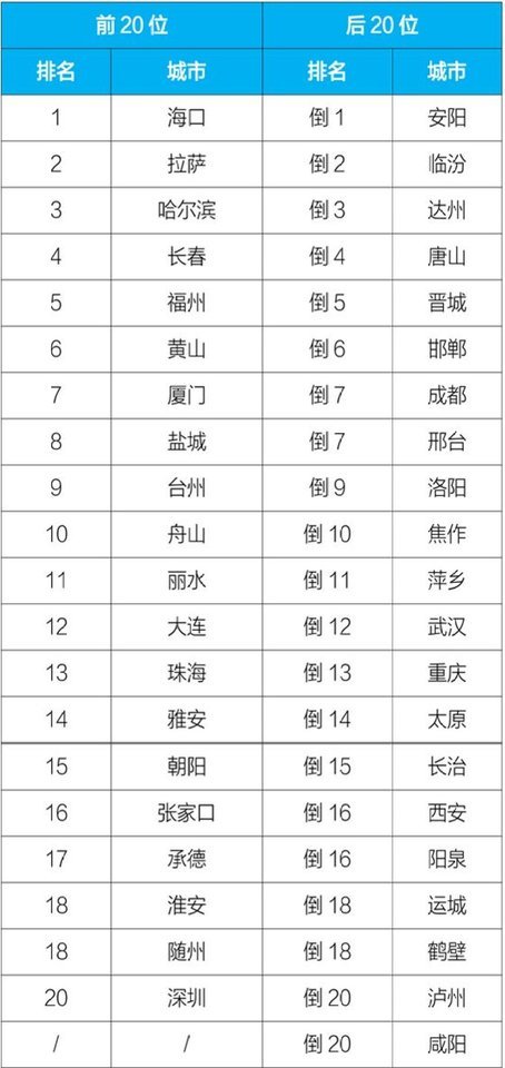 排名前20位和后20位城市名单