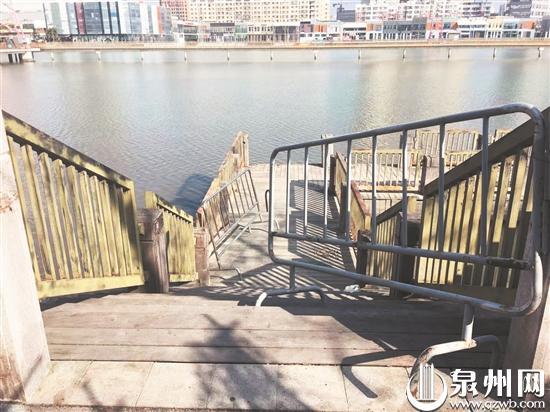 该处木栈道位于市区浦西万达广场后面的水口湖靠江滨北路一侧,在东西两边各有一处木栈道。西边的木栈道入口没有铁栏防护,在木栈道的亲水平台上,护栏出现多处缺失的情况,部分护栏脱落在地上,木板也凹凸不平。东边的木栈道则破坏尤为严重,虽然入口有铁护栏防护,上面贴的警示牌写着“水深危险,禁止攀爬”,但已被人挪开,木栈道楼梯口的护栏不见踪影。