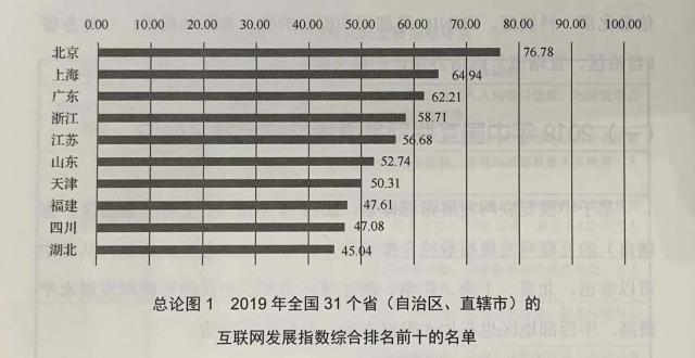 据《报告》,2019年全国31个省(自治区、直辖市)的互联网发展指数综合排名前十的名单为:北京、上海、广东、浙江、江苏、山东、天津、福建、四川、湖北。经济发达地区的互联网发展水平最高,中西部地区也在加大发展力度,发展势头强劲。中国互联网发展指数涵盖了信息基础设施建设、创新能力、数字经济发展、互联网应用、网络安全和网络治理六个方面。