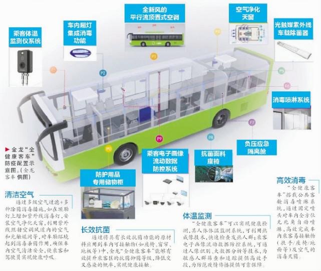 据介绍,金龙“全健康客车”通过配备多项关键性设施和多种智能化系统,可实现“健康呼吸”“健康接触”“健康检测”“健康防护”四种强大功能。