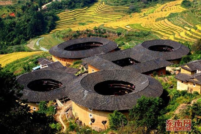 俗称“四菜一汤”的南靖田螺坑土楼群是福建土楼的代表性建筑。黄亮忠 摄