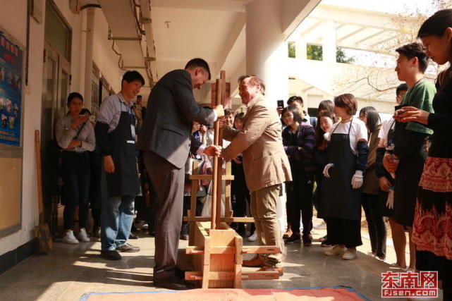与高校“联姻”则是另外一种有效途径。同样是在客家土楼夯土体验馆,入口处悬挂着“厦门大学嘉庚学院建筑学院教学实践基地”的牌匾。这个实践基地的主要发起人、厦门大学嘉庚学院建筑学院副院长李鎨翰教授来自宝岛台湾,“痴迷”闽南风格建筑,对土楼夯筑技艺有独到的研究。他表示,南靖县境内大型土楼数量多,历史悠久,形状各异,是研究土楼夯筑技艺的活素材。“我们有一支完善的科研实践团队,在学校也有实验夯筑建造的场地。在南靖土楼设立教学实践基地便于把师生的实践成果服务于南靖土楼保护。”