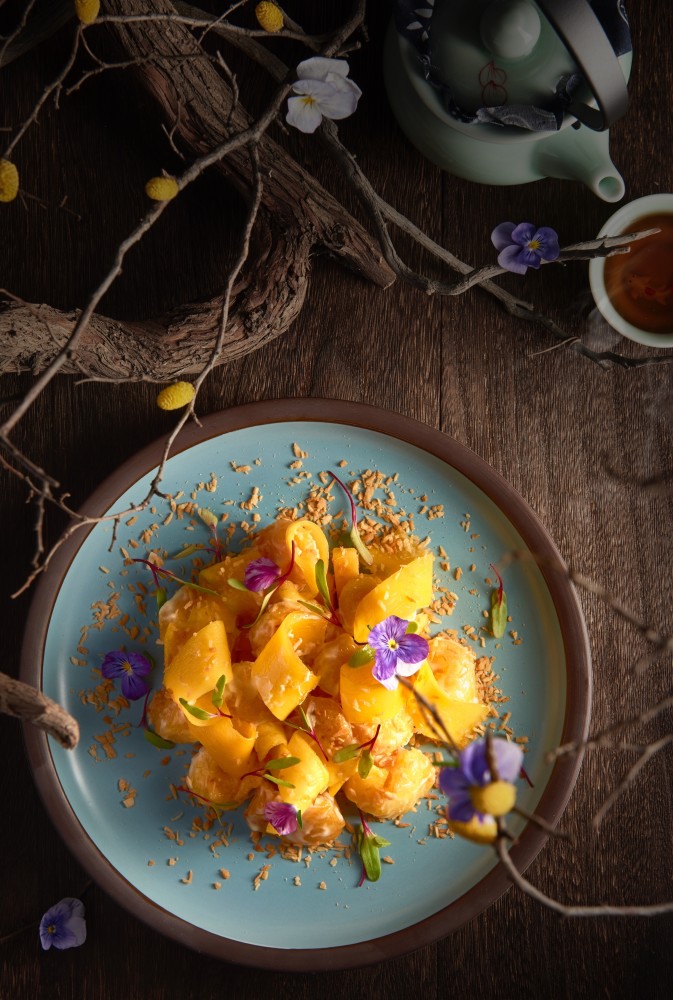 仙气缓缓从盘中升腾,轻撒一把椰片,新鲜的热带芒果搭配金黄香酥的虾仁,一起入口虾仁的鲜甜中和芒果的浓郁果香,增添了干脆的口感。回味有些许椰香在舌尖回荡。