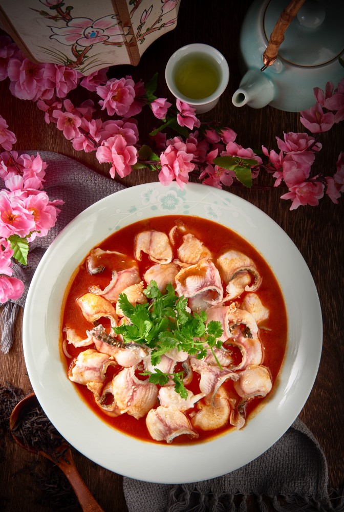 谷雨后制作的大红袍香气馥郁,搭配新鲜黑鱼片腌制入味,白鲫鱼煎至金黄熬成浓稠鱼汤加入特制底料和大红袍熬制30分钟后过滤,放入配菜调味。武夷奇茗入膳,与肥美鱼鲜妙笔生花的结合。