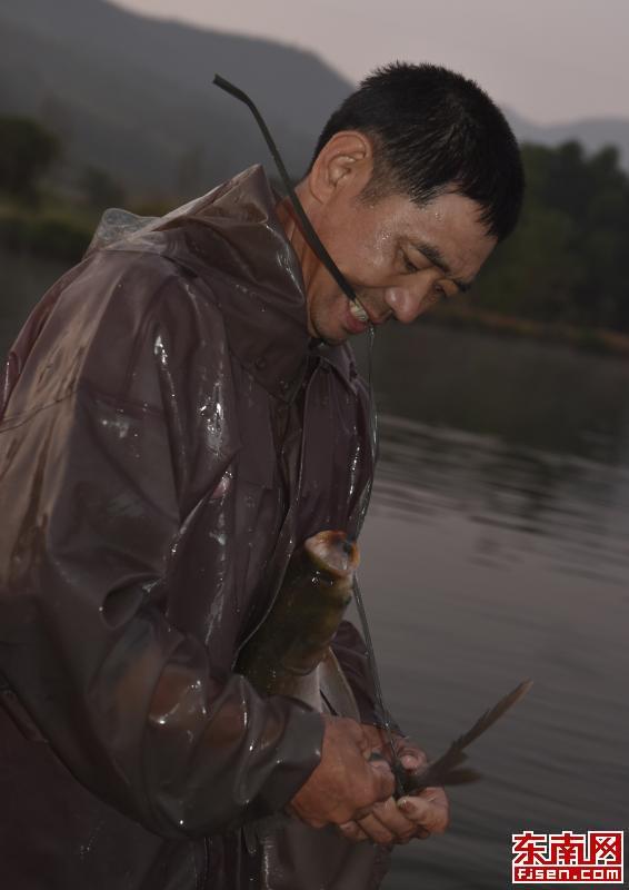 叶万义将捕获的塘鱼进行“弓鱼”作业。