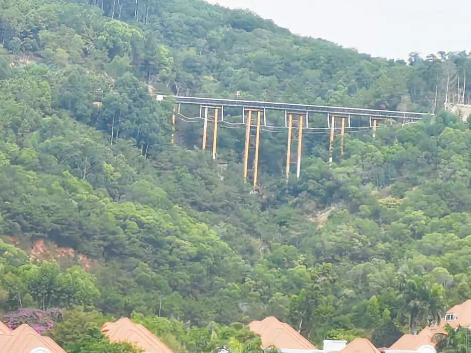 节点七桥梁底部两侧各有一根高钒索,呈半弧形,这个造型让桥梁充满曲线感。厦门健康步道项目总负责人王摩西解释,其实这两根高钒索是桥梁的主要受力结构,高钒索张开后把整个桥面撑起来。高钒索单根的重量达到8.15吨,为了运载它们,要搭设大型货运索道,在山下方提前展索,吊车配合将索吊挂在货运索道上,并设14个吊点,均布荷载上山。然后,在桥西侧配备小型挖掘机配合,每个吊点逐个卸载并放在定制索导轨轮上,最后再正常牵引。