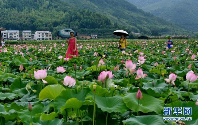 游客在武夷山市五夫镇万亩荷田赏荷(7月12日摄)。新华社记者 张国俊 摄