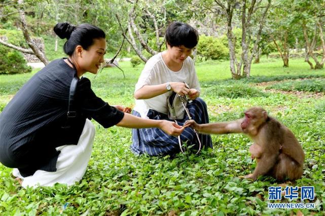 游客在武夷山自然保护区喂猴(7月20日摄)。