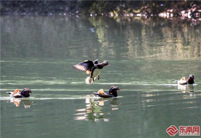 15日,时值初冬,建宁县闽江源国家湿地公园迎来近百只野生鸳鸯,它们愉快地嬉戏、觅食。