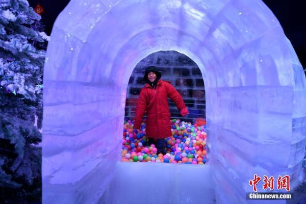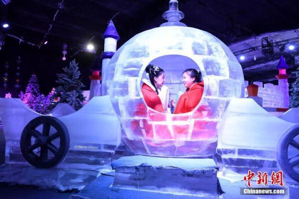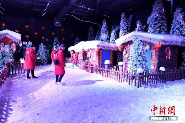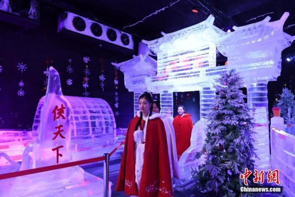 1月19日,游客在福建省尤溪县侠天下景区里的“冰雪江湖”体验北国风光。“冰雪江湖”恒温零下10度,是以侠文化体验、观赏、互动为主题打造的冰雪世界。中新社记者 王东明 摄