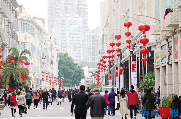 瞧,湖滨北路的电线杆旁,一串串红通通的小灯笼随风摇摆,给车水马龙的道路增添了不少喜庆的氛围。中山路上,独特的骑楼建筑外,一串串大红灯笼高高挂起,配上红色的福字,春节的浓郁气息迎面而来。