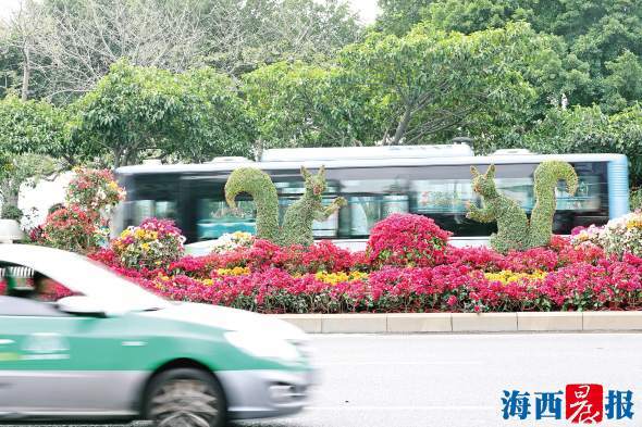 这些红灯笼仅是营造氛围的小小点缀,城市内主要公园和重要节点的彩化才是重头戏。人民会堂周边布置了多处彩化园林造景。湖滨北路一侧,金鼠送福的园林造景吸引眼球,以市花三角梅为主角,颜色丰富,层次分明,立体感十足。
