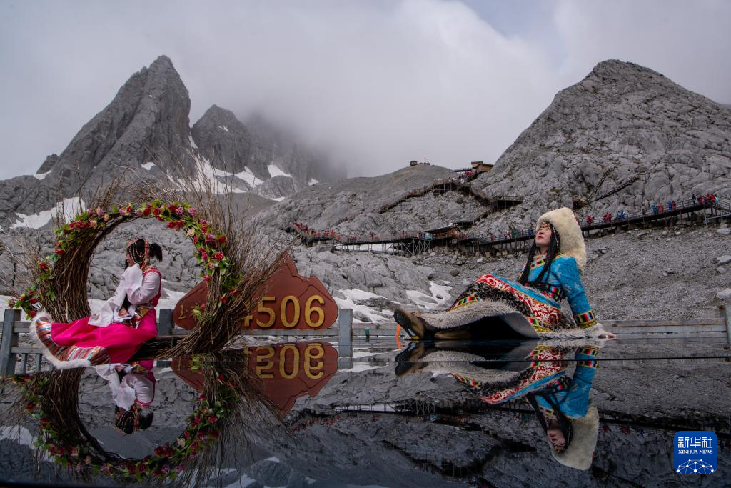 6月26日,游客在玉龙雪山景区拍照留念。据云南省丽江市玉龙雪山省级旅游开发区管委会介绍,近日,玉龙雪山景区旅游持续回暖,游客数量显着增长。新华社记者 江文耀 摄