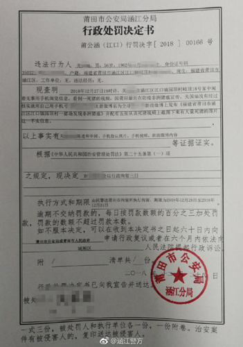 涵江警方发布对关某某的行政处罚决定书