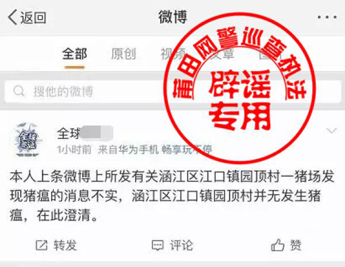 2018年12月27日晚7点多,家住涵江区江口镇的关某某,在家中闲来无事用手机浏览网页信息,看到一死猪视频,想起近期我市各级在全力防控非洲猪瘟,他“灵机一动”、未经核实便用其本人名为“全球XX”的新浪微博发布了“福建省莆田市涵江区江口镇园顶村一猪场发现非洲猪瘟”,并配有5张从该视频上截下的带有大量死猪画面图片的不实信息。