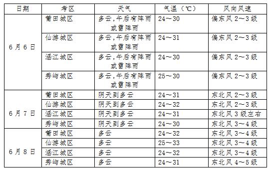 东南网记者从莆田市气象局获悉,根据该局6月5日发布的天气预报显示,今年高考期间,莆田市天气总体较好,7-8日以多云到阴天为主,无明显降水和高温天气,今年第4号台风对该市无影响。